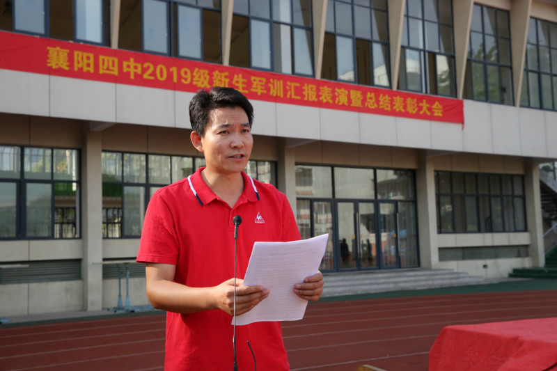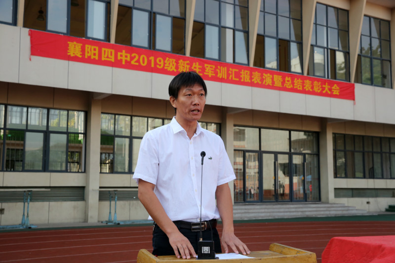 在全場合唱結(jié)束后,郭士念老師繼續(xù)主持本次軍訓(xùn)的總結(jié)表彰大會。高一年級主任朱天斌老師首先對本次軍訓(xùn)進(jìn)行了總結(jié)。隨后,副校長陳登江老師宣布了28日晚的紅歌合唱比賽結(jié)果并宣讀了襄陽四中《關(guān)于表彰2019級新生軍訓(xùn)“優(yōu)秀連隊(duì)”、“優(yōu)秀教官”、“優(yōu)秀學(xué)員”的決定》,出席表彰大會的領(lǐng)導(dǎo)為受表彰的先進(jìn)集體和先進(jìn)個人頒發(fā)了證書并與他們合影留念。在特警支隊(duì)政委朱碧嵐同志的總結(jié)講話之后,校長李靜發(fā)表了總結(jié)講話,對學(xué)生們表達(dá)了贊揚(yáng)和殷切的希望。李校長希望同學(xué)們能夠“在襄陽四中厚植基礎(chǔ),度過三年充實(shí)時光,做優(yōu)秀四中人,遇見最好的自己”并努力成為“點(diǎn)亮夢想、明確努力方向的四中人”“胸懷祖國、筑牢發(fā)展根基的求知者”和“努力前行、創(chuàng)造美好未來的實(shí)力派”。